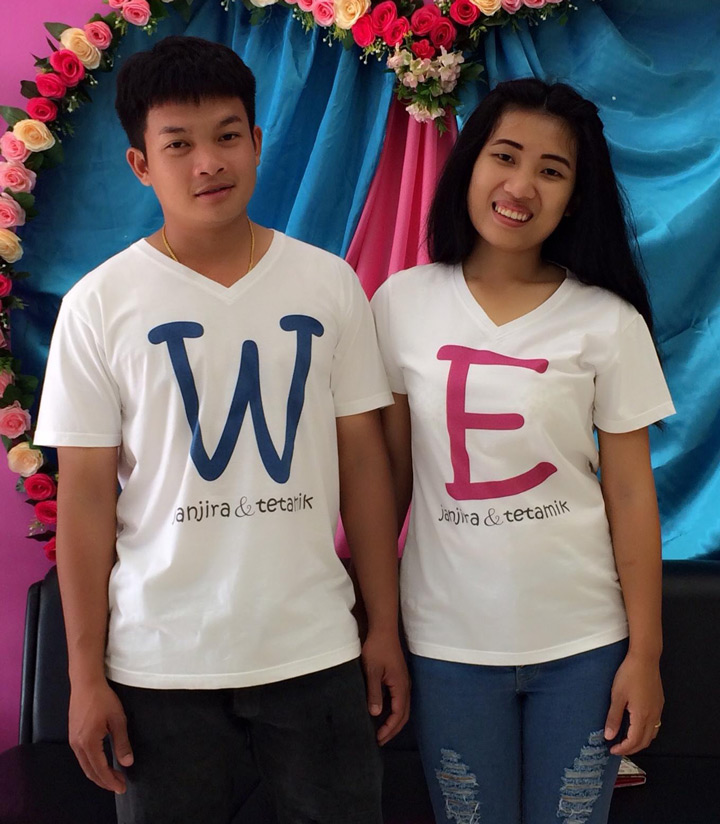 เสื้อคู่ / เสื้อคู่รักสองตัวนี้ คุณจันทร์จิราสั่งสกรีนมาครับ โดยตัวของผู้ชายจะเป็น W สีฟ้า ของผู้หญิงเป็น E สีชมพู พร้อมชื่อของทั้งสองคนสกรีนอยู่ข้างล่าง เมื่ออ่านต่อกันจะเป็นคำว่า WE พอดี 😀 ขอบคุณมากๆ นะครับ เย้
